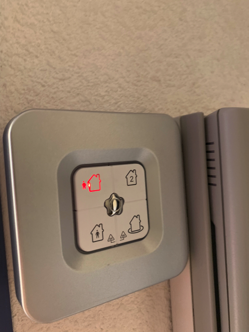 Una vez esté todo revisado y ya puedas cerrar la casa, simplemente pulsa el botón superior izquierdo (moñeco fuera de la casa) y la alarma dará unos pitidos avisando de que se procede a conectar, tienes unos 10 segundos para cerrar la puerta.